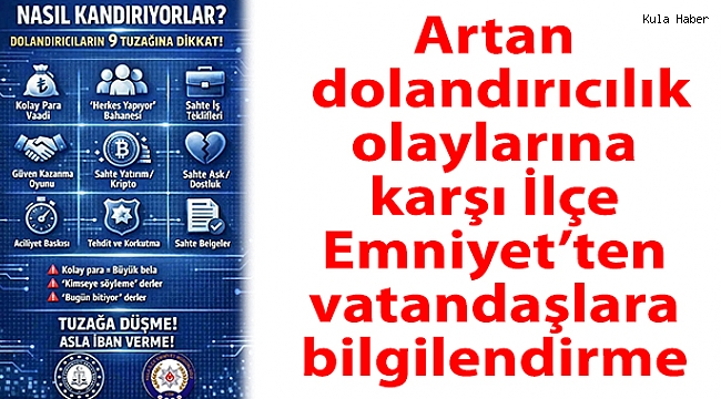 Manisa’nın Kula ilçesinde son dönemde artış gösteren dolandırıcılık olaylarına karşı kapsamlı bilgilendirme çalışmaları başlatıldı. Kula İlçe Emniyet Müdürlüğü tarafından yürütülen çalışmalar kapsamında vatandaşların dolandırıcılık yöntemlerine karşı bilinçlendirilmesi hedefleniyor.