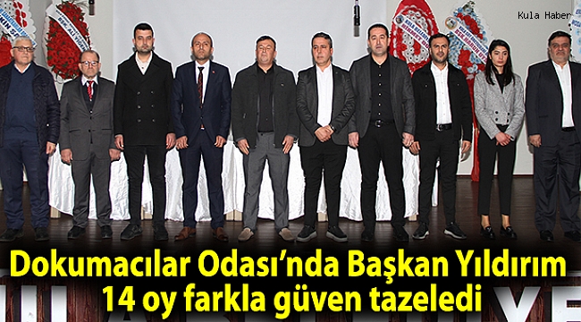 Kula Dokumacılar Konfeksiyoncular Tuhafiyeciler ve Manifaturacılar Esnaf Odası’nın bugün yapılan olağan genel kurulunda mevcut Başkan Ercan Yıldırım rakibi Fehmi Yıldırım karşısında 14 oy farkla güven tazeledi.