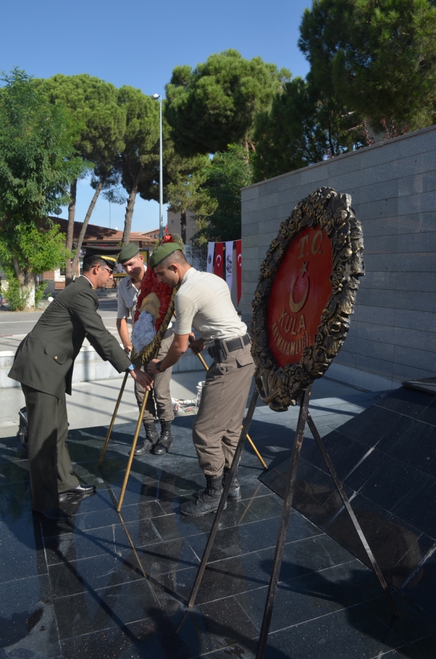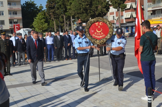 Törende, saygı duruşu ve İstiklal Marşı'nın okunmasının ardından Türkiye Muharip Gaziler Derneği Kula Şubesi adına konuşma yapan Kıbrıs Gazisi İsmail Kara, "Vatan savunmasında şehit ve gazi olmak kadar güzel bir kavram olamaz. Şehitler nurlanmış, gazi onurlanmış askerdir. Şanlı tarihimizin zaferleri hiçbir zaman unutulmamalıdır. Zafer günlerine bu zaferlerin kahramanlarına layık oldukları değer. Her zaman her yerde verilmelidir. Savaşlara ve bu savaşların gazilerine olan ilgisizlik, şanlı tarihimizle olan bağı koparır. Aziz şehitlerimiz ve gazilerimiz her zaman hatırlanmalıdır. Şehit ve gazisi olmayan Türk ailesi yok gibidir. Bu nedenle şehit ve gazi Türk toplumunun ortak değeridir." diye konuştu.