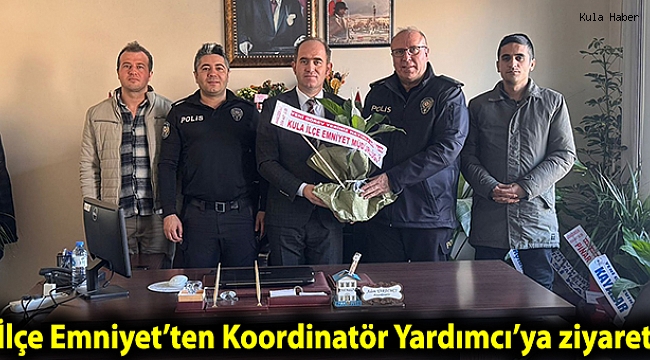 Kula İlçe Emniyet Müdürü Secaattin Aktay, Manisa Büyükşehir Belediyesi Kula Genel Koordinatörü Adem Yardımcı’yı makamında ziyaret etti. Gerçekleştirilen ziyarette, Kula İlçe Emniyet Müdürü Secaattin Aktay ile birlikte Komiserler Taner Vural, Sadi Ahmet Akkuş ve Servet Ceren' de bulundu.