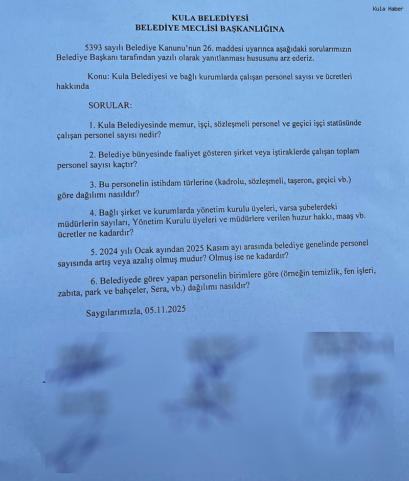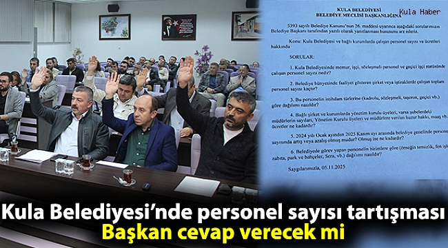 Kula Belediyesi’nde personel sayısı yeniden gündemde. Cumhur ittifakı Belediye Meclis Üyeleri, belediyede görev yapan personel sayısı ve çalışanların görev dağılımıyla ilgili hazırladıkları soru önergesini meclise sundu. Ancak önerge, mecliste reddedildi.