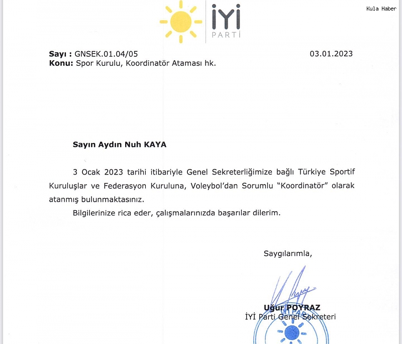 Geçtiğimiz yıl içerisinde İYİ Parti'ye katılmasının ardından siyasi çalışmalarına hız veren Kulalı iş insanı Aydın Kaya'ya İYİ Parti'de anlamlı bir görev verildi. Spora ve sporcuya yaptığı yatırım ve desteklerin yanı sıra Misli.com Sultanlar Ligi'nde mücadele eden SigortaShop Spor Kulübü'nün de başkanlığını yapan Aydın Kaya'ya, İYİ Parti Genel Başkanı Meral Akşener'in direktifleri ve İYİ Parti Genel Sekreteri Uğur Poyraz'ın imzasıyla İYİ Parti Genel Sekreterliğine bağlı Türkiye Sportif Kuruluşlar ve Federasyon Kurulu’na voleyboldan sorumlu koordinatör olarak görev verildi.