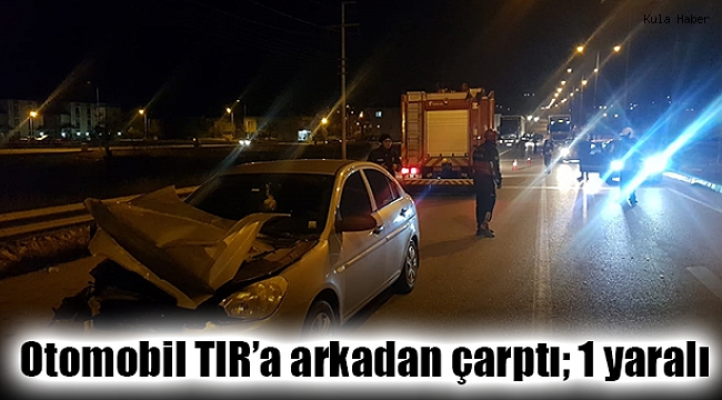 Kaza, saat 01.00 sıralarında İzmir-Ankara D300 karayolu Jandarma Kavşağında meydana geldi. Edinilen bilgiye göre, İzmir istikametinden Uşak istikametine seyir halinde olan Seviç Topaloğlu idaresindeki 25EM 563 plakalı otomobil, aynı yönde seyir halinde olan 42 TH 805 plakalı TIR’A arkadan çarptı. Çarpmanın etkisiyle otomobil sürücüsü Topaloğlu yaralandı. Kazayı görenlerin haber vermesi ile olay yerine sağlık ve polis ekipleri sevk edildi. İlk müdahalesi olay yerinde yapılan otomobil sürücüsü, Kula Devlet Hastanesi’nde tedavi altına alındı. Yaralı Topaloğlu’nun hayati tehlikesinin bulunmadığı öğrenilirken, polis ekipleri kaza ile ilgili soruşturma başlattı.