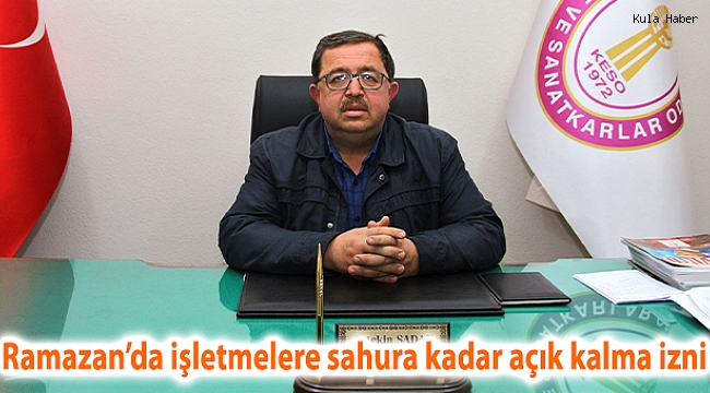 Kula Esnaf ve Sanatkarlar Odası Başkanı Aytekin Şadan, lokanta, kafe, kahvehane ve pastanelerin Ramazan ayı boyunca sahur saatine kadar açık kalabileceğini açıkladı.