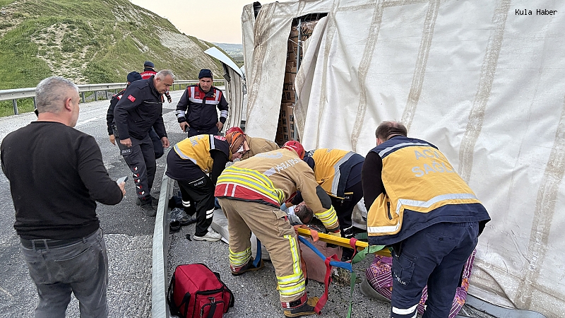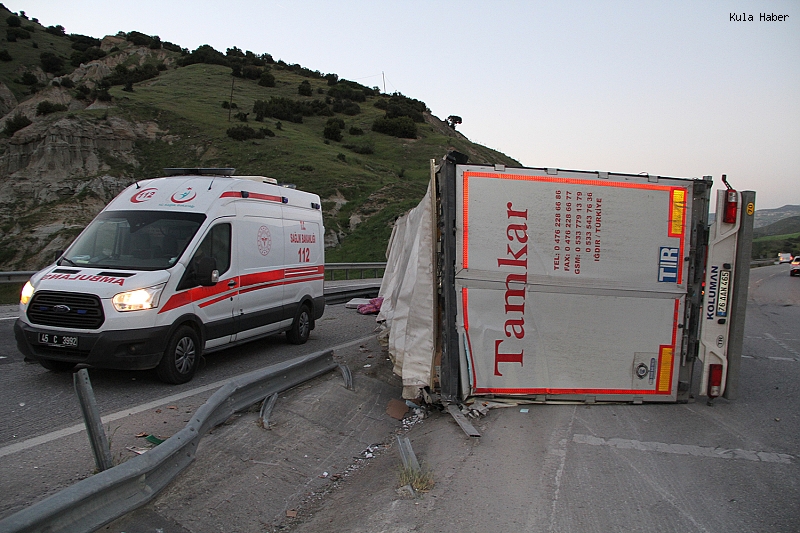Kaza, saat 19.45 sıralarında İzmir – Ankara D300 karayolu üzerinde, Peribacaları mevkii yakınlarında bulunan Güvercinlik Rampaları’nda meydana geldi. Edinilen bilgilere göre, İzmir istikametinden Uşak yönüne seyir halinde olan Mehmet Murat Koylu (62) idaresindeki 76 AJ 328 plakalı tır, sürücüsünün direksiyon hâkimiyetini kaybetmesi sonucu kontrolden çıktı. Savrulan araç, orta refüjdeki bariyerlere çarparak devrildi. Kazayı görenlerin 112 Acil Çağrı Merkezi’ne bildirmesi üzerine olay yerine itfaiye, ambulans ve polis ekipleri sevk edildi. Yaralı sürücü olay yerinde yapılan ilk müdahalenin ardından 112 Acil Servis Ekipleri vasıtasıyla Kula Devlet Hastanesi’ne kaldırıldı. Sürücünün hayati tehlikesinin olmadığı öğrenildi.