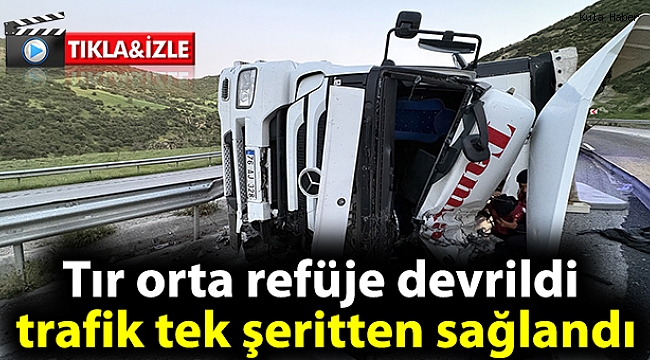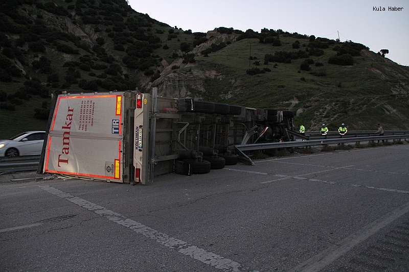Manisa’nın Kula ilçesinde kontrolden çıkan tır orta refüje çarparak devrildi. Kaza nedeniyle İzmir – Ankara D300 karayolunda trafik akışı bir süre kontrollü olarak tek şeritten sağlandı.