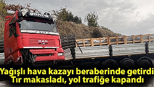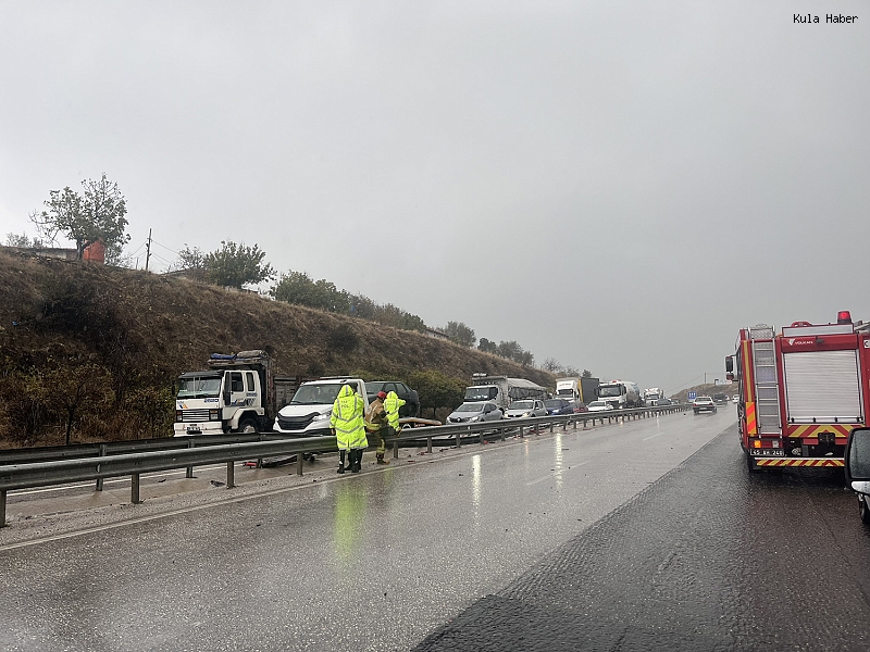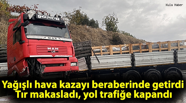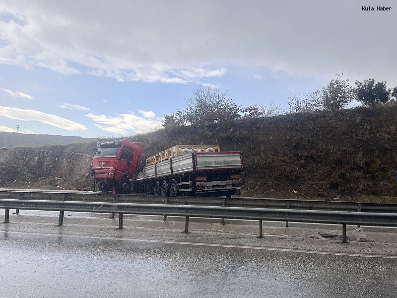 Manisa’nın Kula ilçesinde etkili olan yağışlı hava, trafik kazasını da beraberinde getirdi. Sürücüsünün kontrolünden çıkan tır makaslayarak yolu kapattı. Kaza nedeniyle İzmir – Ankara D300 karayolunun Uşak istikametine trafik bir süre sağlanamadı.